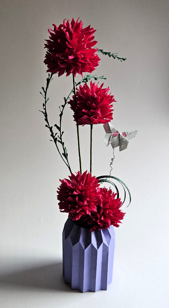 Eine Gewürzdose aus Pappe dient als Blumentopf, der mit Plissee-Falttechnik aus Tonpapier verkleidet wird, Blumen aus Krepppapier